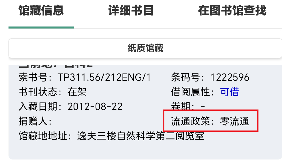 ① OPAC系统PC端:https://findhsu.libsp.cn(也可从图书馆官网主页进入),输入图书检索词查找目标图书,在馆藏信息的“流通政策”栏目中查看图书是否标注为 “零流通”(详见图1)。