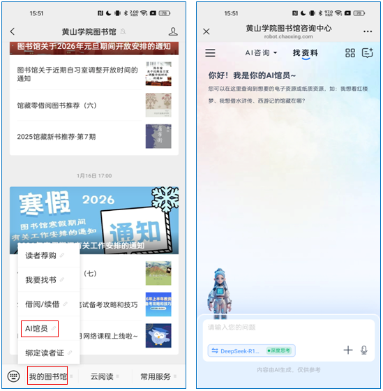 关注黄山学院图书馆微信公众号,点击“我的图书馆”,选择“AI馆员”,可以随时咨询图书馆相关问题。