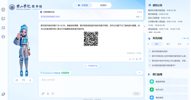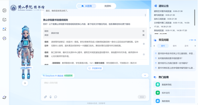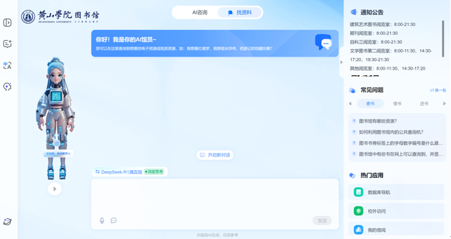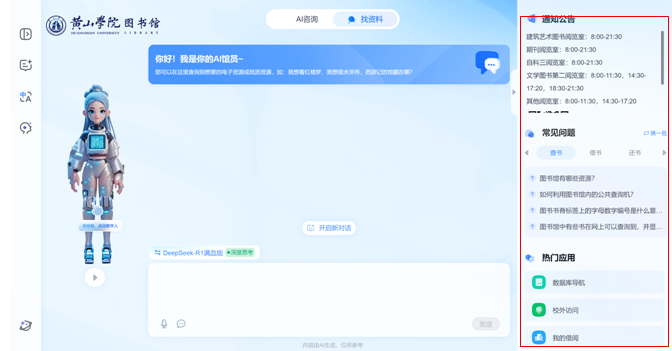 为全面提升图书馆服务信息化水平,全方位优化师生使用体验,深入推进智慧图书馆建设,黄山学院图书馆与超星集团合作,正式推出“AI馆员”——一款深度集成DeepSeek-R1大模型能力的智能服务助手。该工具系统整合了图书馆日常规范、使用指南及便捷服务内容,为师生的各类咨询提供高效、精准的智能化支持。
