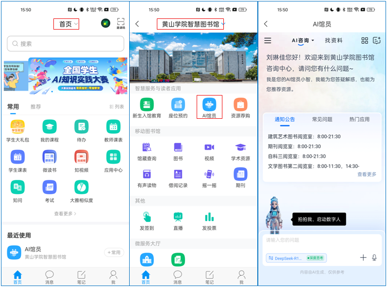 打开“学习通”app,首页单位切换为“黄山学院智慧图书馆”,找到“AI馆员”,点击即可互动交流。