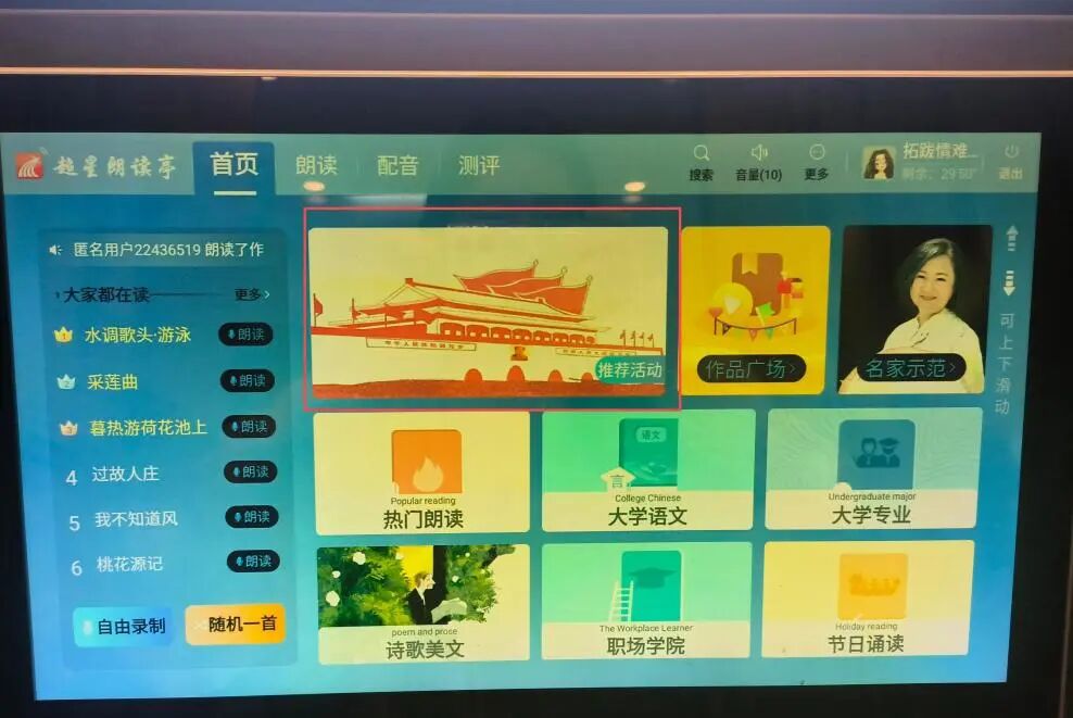 (4)测试:进入活动专区(图中红色框专区),自主选择专区内素材参与朗读。