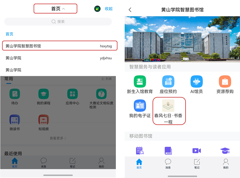 2.打卡平台:读者通过超星“学习通”平台,“首页”切换“黄山学院智慧图书馆”,点击“春风七日•书香一程”参与活动。